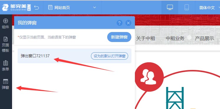 彈窗你可以理解為一個(gè)區(qū)域范圍,只是為彈出的顯示范圍,那么彈窗里的內(nèi)容可以支持任意內(nèi)容,可以是廣告圖片文字、最新文章列表、會員注冊登錄組件、調(diào)查問卷表單等,如同設(shè)計(jì)網(wǎng)站頁面一樣。一旦彈窗內(nèi)容設(shè)計(jì)完成,需要退出彈窗編輯狀態(tài),如需對彈窗的內(nèi)容重新設(shè)計(jì),就需要進(jìn)入彈窗編輯,學(xué)會進(jìn)入彈窗編輯和退出彈窗編輯,網(wǎng)站頁面有彈窗功能再也不用愁了。1、點(diǎn)擊這里退出彈窗編輯