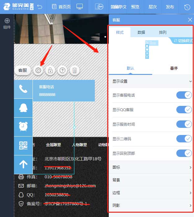 設(shè)置在線客服樣式與數(shù)值,樣式是指在線客服的外觀效果;數(shù)值是指QQ、電話、二維碼的設(shè)置,方法如下圖所示: