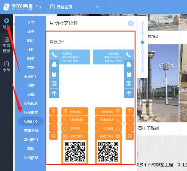 為了讓網(wǎng)站所有頁面都浮動有在線客服,先切換到網(wǎng)站頭尾文件,點(diǎn)組件-互動社交-客服控件-選擇其中一個(gè)-在頁尾處點(diǎn)擊一下,就這樣就生成一個(gè)在線客服,如下圖: