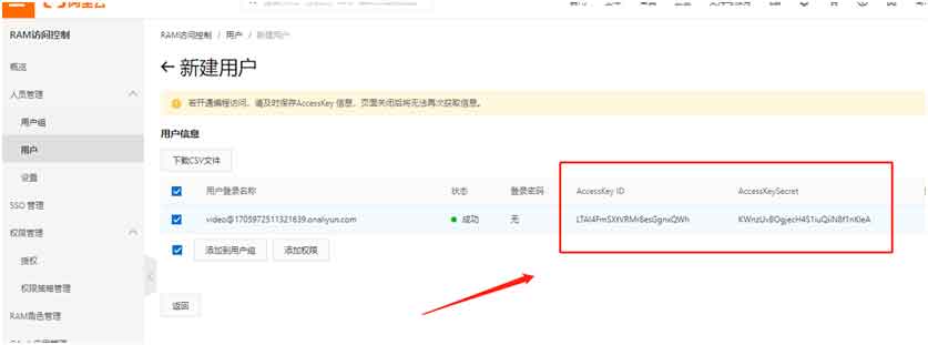 方法如圖所示:新建AccessKey子用戶后再對用戶進行權(quán)限設置,將所有視頻點播加入授權(quán),然后再找到AccessKeyID與AccessKeySecret值,