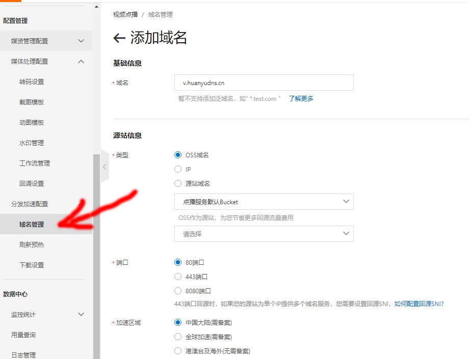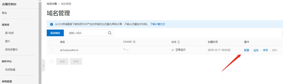 申請(qǐng)了視頻空間后,進(jìn)入視頻控制臺(tái),找到域名管理,好比虛擬主機(jī)需要綁定訪問域名一樣,在這里需要綁定視頻播放域名,如下圖所示,域名一旦綁定將會(huì)生成一個(gè)CNAME地址,需要在域名管理那里做一下解析。
