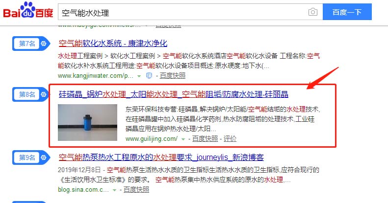 網(wǎng)站www.guilijing.com是宣傳韓國(guó)進(jìn)口硅麗晶,關(guān)鍵詞“硅麗晶”在百度排名一直很好,過去該網(wǎng)站一直在做競(jìng)價(jià)推廣,如今網(wǎng)站負(fù)責(zé)人在我司建議指導(dǎo)下,重視網(wǎng)站優(yōu)化自然排名,推廣效果更加顯著,網(wǎng)站推廣成本減少90%。為了推廣業(yè)務(wù)來(lái)源,網(wǎng)站開始優(yōu)化關(guān)鍵詞“空氣能水處理”、“太陽(yáng)能水處理”等排名,排名如下。