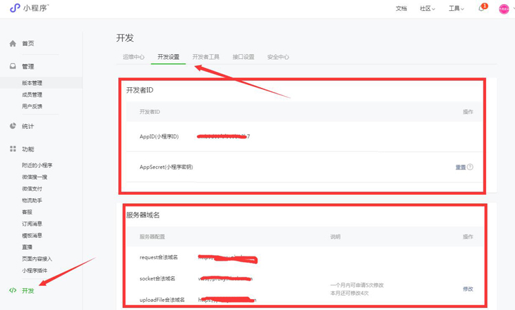 小程序AppID(小程序ID)、AppSecret(小程序密鑰)、服務器域名在這里,如下圖: