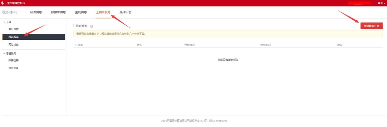 登錄 虛擬主機(jī)控制面板 > 工具&服務(wù) > 網(wǎng)站搬家 > 新建搬家任務(wù) 。
