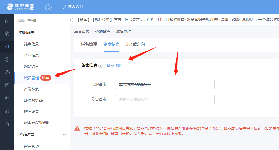 備案號(hào)在這里并設(shè)置樣式保存后,如果有公安備案審批下來的備案號(hào),請(qǐng)?zhí)顚憣?duì)應(yīng)的框里;如果未在網(wǎng)站底部添加備案號(hào),被相關(guān)部門核查出來將處以五千元以上一萬元以下罰款...